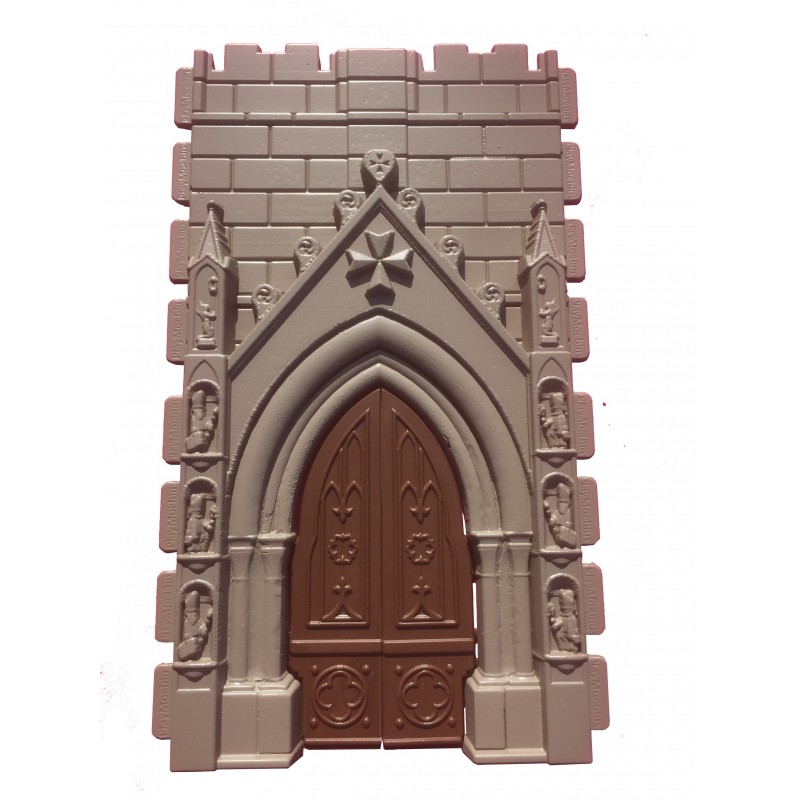 Puerta de iglesia con cruz templaria. De tamaño 2x2 steck es una pieza fabricada en resina y de gran resistencia. Incluye las puerta que se pueden abrir y están sujetas por dos enganches en la parte posterior de la pieza.